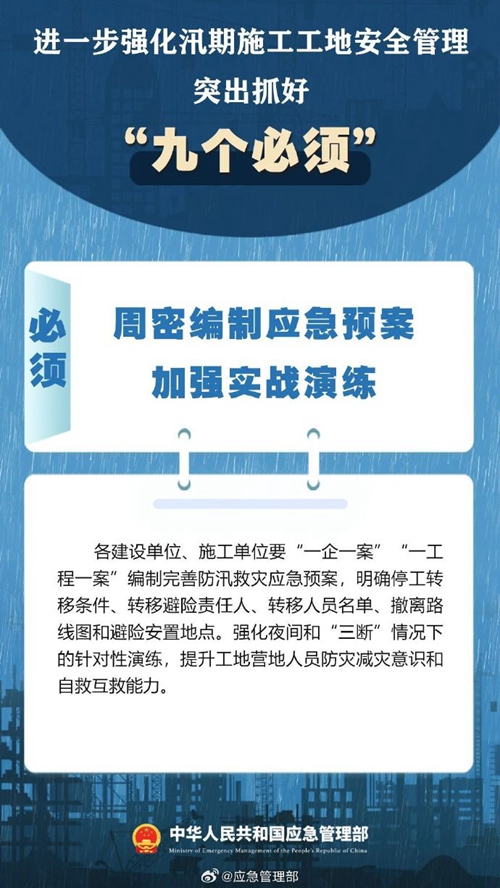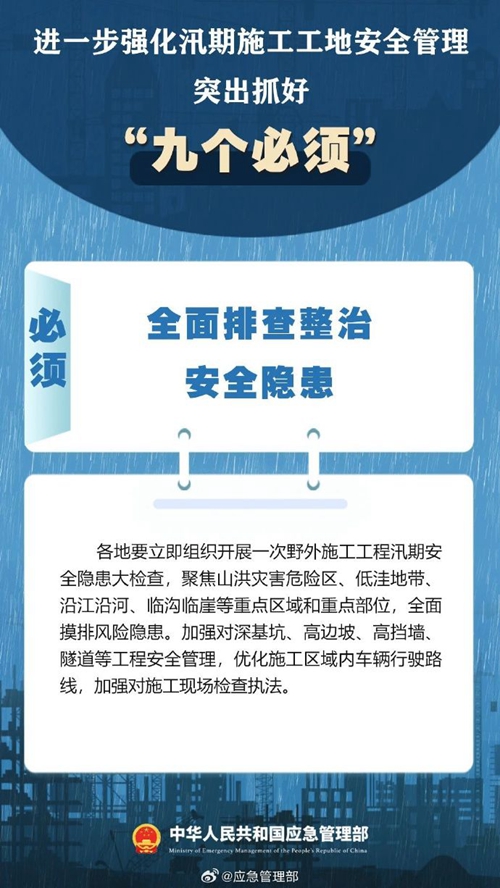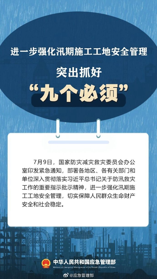 7月9日,國家防災減災救災委員會辦公室印發(fā)緊急通知,進一步強化汛期施工工地安全管理,要突出抓好“九個必須”↓↓ ???