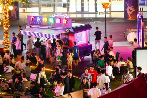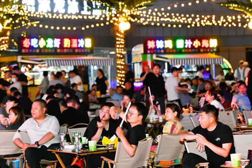 熠熠星光耀向夜空,呼應(yīng)著霓虹閃爍的奧體中心,飄散的煙火氣和美食的香氣充斥著整個(gè)下沉空間,舞臺(tái)音樂(lè)節(jié)奏歡快、火爆酷炫,在霓虹交錯(cuò)的空間里,一天的時(shí)間仿佛被夜市拉長(zhǎng),這是年輕人帶給這座城市的無(wú)限活力。