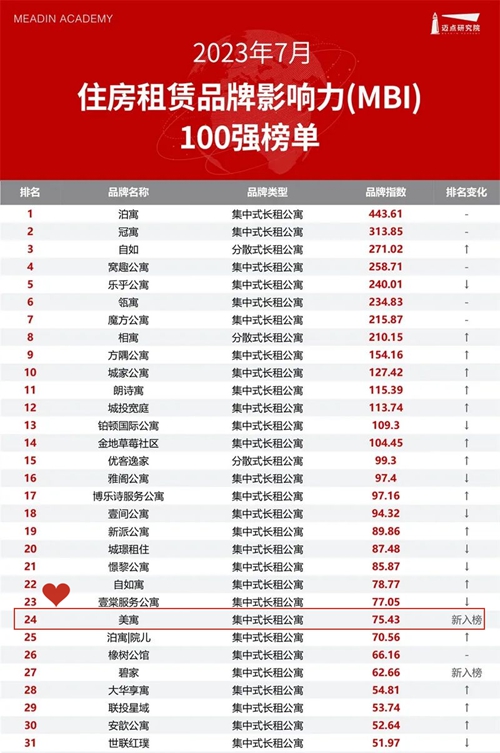 邁點研究院獨家發(fā)布的“2023年7月住房租賃品牌影響力(MBI)100強(qiáng)榜單”。鄭州城市發(fā)展集團(tuán)城發(fā)美寓進(jìn)入榜單前二十五。