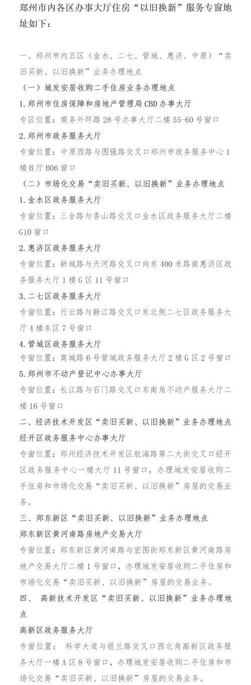 7月16日,記者從鄭州市房管局獲悉,為促進(jìn)該市房地產(chǎn)市場“賣舊買新、以舊換新”政策進(jìn)一步落實,鄭州市房管局會同稅務(wù)、不動產(chǎn)登記等部門,認(rèn)真梳理工作流程、全面開設(shè)服務(wù)專區(qū),全力推進(jìn)住房“以舊換新”工作。目前,鄭州市內(nèi)8區(qū)10個辦事大廳均開設(shè)“以舊換新”服務(wù)專窗,辦理相關(guān)業(yè)務(wù)可享受“專人專窗”的服務(wù)。