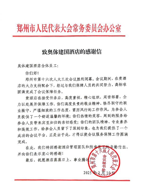 2025年2月10日,鄭州市第十六屆人民代表大會第三次會議第二次全體會議勝利閉幕。鄭州城市發(fā)展集團旗下河南鄭地奧體建國飯店作為本次大會的駐地保障酒店,以“五星”服務(wù)標準(環(huán)境舒心、食宿貼心、細節(jié)暖心、保障安心、文化潤心),圓滿完成了各項接待任務(wù),贏得了與會代表和會務(wù)組的一致好評。