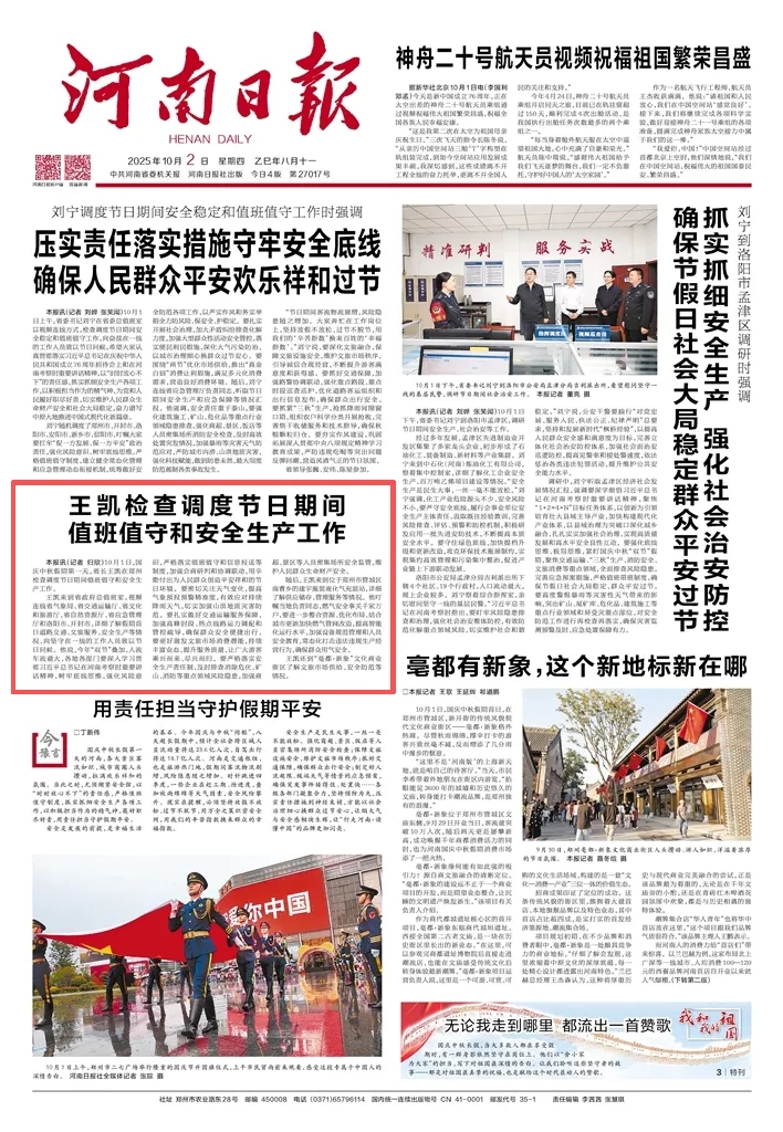 王凱來到省政府總值班室,視頻連線省氣象局、省交通運輸廳、省文化和旅游廳、省自然資源廳、省應(yīng)急管理廳和洛陽市、開封市,詳細了解假期首日道路交通、文旅服務(wù)、安全生產(chǎn)等情況,向堅守在一線的工作人員致以節(jié)日問候。他說,今年“雙節(jié)”疊加,人流車流量大,各地各部門要深入學(xué)習(xí)貫徹習(xí)近平總書記在河南考察時重要講話精神,樹牢底線思維,強化風(fēng)險意識,嚴格落實值班值守和信息報送等制度,加強會商研判和協(xié)調(diào)聯(lián)動,用辛勤付出為人民群眾創(chuàng)造平安祥和的節(jié)日環(huán)境。要密切關(guān)注天氣變化,提高氣象預(yù)報預(yù)警精準度,有效應(yīng)對持續(xù)降雨天氣,切實加強山洪地質(zhì)災(zāi)害防范。要扎實做好交通運輸服務(wù)保障,加強高峰時段、熱點線路運力調(diào)配和管控疏導(dǎo),確保群眾安全便捷出行。要更好激發(fā)文旅市場消費潛能,持續(xù)豐富業(yè)態(tài),提升服務(wù)質(zhì)量,讓廣大游客乘興而來、盡興而歸。要嚴格落實安全生產(chǎn)責(zé)任制,及時排查消除危化、礦山、消防等重點領(lǐng)域風(fēng)險隱患,加強商超、景區(qū)等人員密集場所安全監(jiān)管,維護人民群眾生命財產(chǎn)安全。