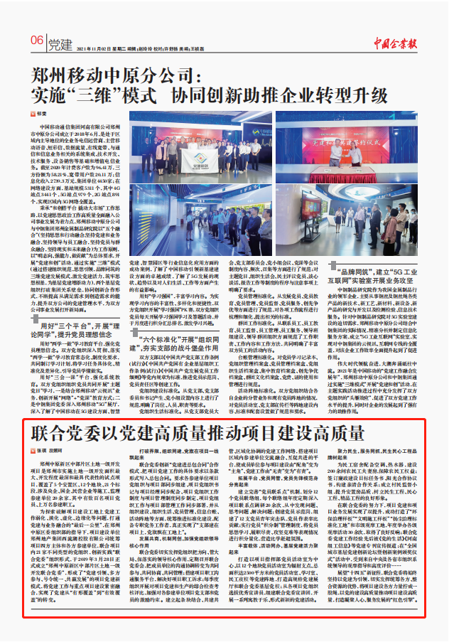 西流湖公司始終堅持“抓好黨建就是最大的政績”,創(chuàng)新“黨建進總包合同”合作模式,貫徹落實“支部建在項目上,黨旗飄在工地上”的工作思路,以中原新區(qū)中部片區(qū)土地一級開發(fā)聯(lián)合黨委和項目黨支部建設(shè)為抓手,以“12343”黨建工作體系為指引,讓黨的主張、黨的作風(fēng)、黨組織的力量在項目建設(shè)中處處彰顯,充分激發(fā)黨員的先鋒模范作用和黨組織的堅強堡壘作用,將黨建轉(zhuǎn)化為生產(chǎn)力,真正實現(xiàn)黨建促發(fā)展的“紅色引擎”作用。公司黨建工作先進經(jīng)驗榮登《中國企業(yè)報》,意味著公司黨建工作先進經(jīng)驗對于全國企業(yè)黨建具有良好的借鑒意義,標志著公司黨建工作及宣傳水平再上新臺階。