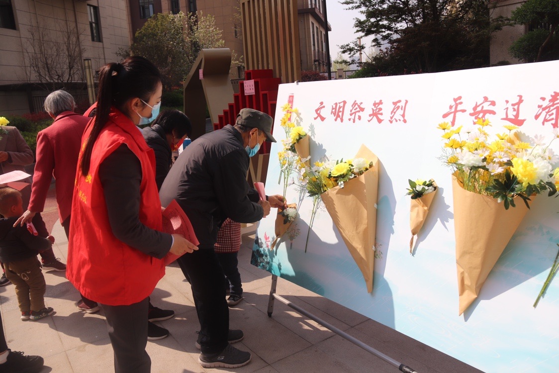 入口處的英烈追思展板吸引了居民們的注意,展板上牛皮紙制作的花束中已經(jīng)放入了不少黃色或白色的小菊花。支部黨員志愿者魯照宇向居民們介紹:“由于疫情原因,不建議集聚在烈士陵園祭祀,我們倡導(dǎo)文明祭祀、綠色祭祀,希望以這種特殊的方式祭奠革命先烈,營造良好社會風(fēng)尚。”居民們拿過一支支小菊花親手粘貼在追思展板上表達(dá)對英烈的敬意,并寫下追憶英雄烈士的留言。